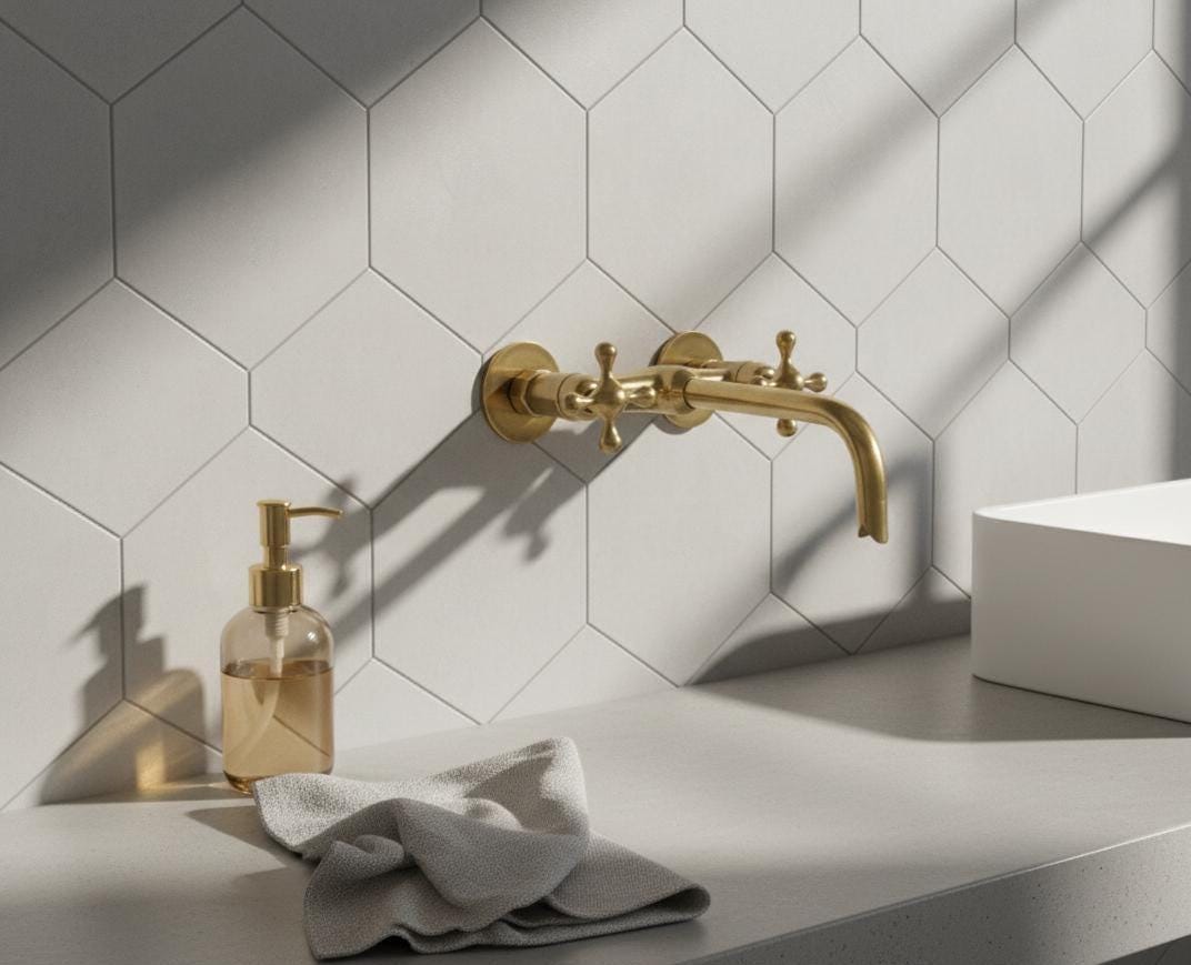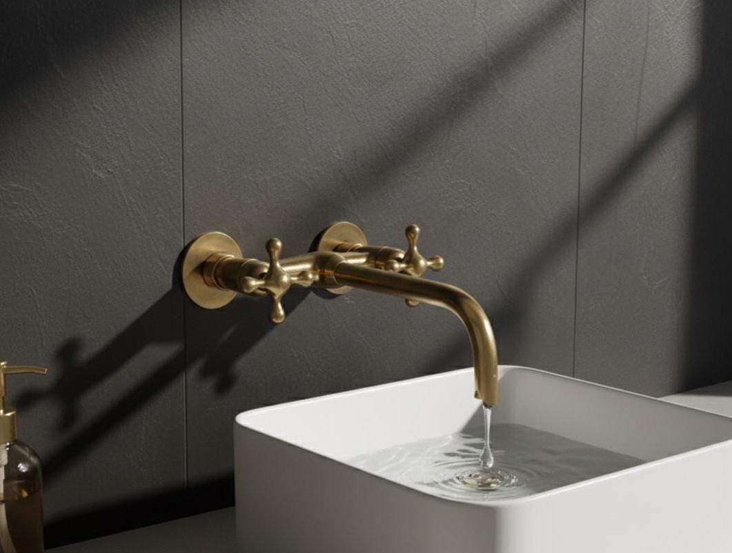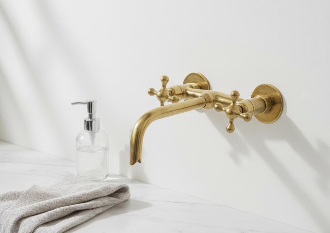 Transform your bathroom with this unlacquered brass wall‑mounted faucet with cross handles. Handcrafted from 100% solid, lead‑free brass, it works as both a vanity sink faucet and a tub filler, delivering the perfect balance of durability, function, and timeless farmhouse style. The living (unlacquered) brass finish develops a natural patina over time, adding authentic vintage character to your space.