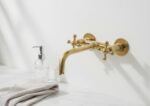 Unlacquered solid brass wall-mounted bathroom faucet with cross handles. Tub filler or vanity tap in vintage farmhouse style. 8–10" spout, 1.2 GPM.